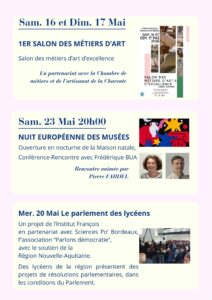 Vous devriez également aimer Parcours « Au fil de l’art » – 2024 14 novembre 2024 Conte en bois – Samedi 12 Octobre 2019 3 octobre 2019 Lecture « Les lettres à Anne » – 23 Juin 2021 22 juin 2021